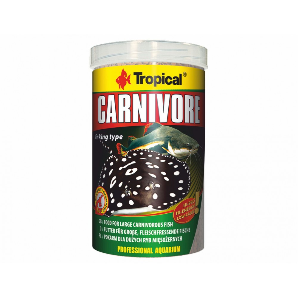 Plnohodnotné, vysokoproteínové krmivo pre veľké mäsožravé ryby prijímajúce potravu z oblasti dna, ako sú Potamotrygonidae, Anguillidae, mäsožravé Loricariidae, Siluridae, Channidae, ako aj iné dravce. Odpovedajúco vybraná zostava zložiek priaznivo vplýva na chutnosť krmiva. CARNIVORE, obohatený o BETA-1,3/1,6-GLUKAN, posilňuje imunitný systém rýb. Vysoký obsah bielkovín ako aj nízky obsah uhľovodanov predchádza obaľovaniu tukom vnútorných orgánov, udržujúc ryby v dokonalej kondícii. Krmivo je vyrobené použitím pokrokovej technológie, umožňujúcej získať vysokú hydrostabilitu a zároveň znamenité chuťové hodnoty.