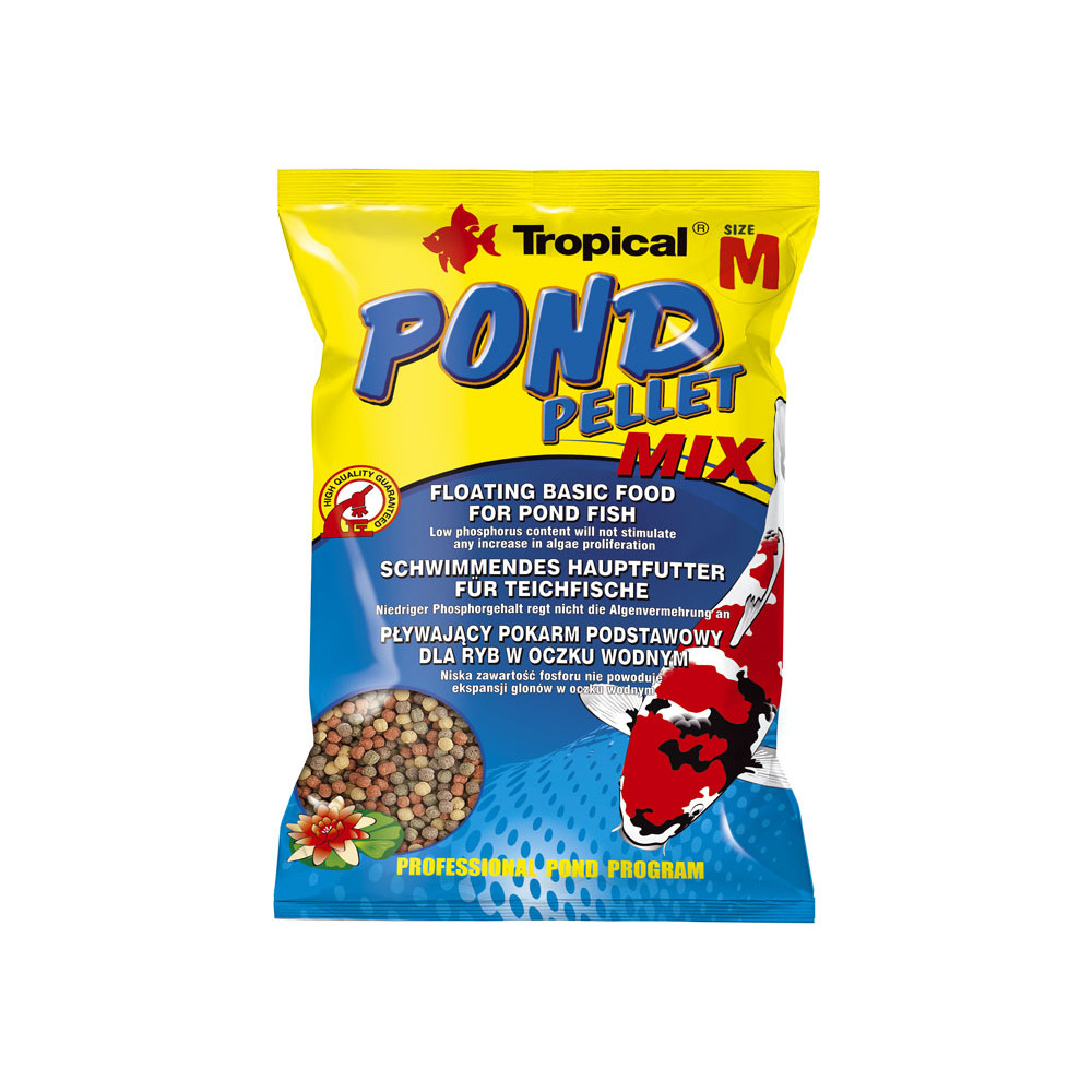 POND PELLET MIX je plnohodnotné krmivo vo forme plávajúcich guličiek pre koi kapre, zlaté rybky, ako aj iné ozdobné kaprovité ryby chované v záhradných jazierkach a rybníkoch. Krmivo v plnej miere uspokojí stravovacie potreby rýb, zvýrazňujúc zároveň ich červené a zlaté vyfarbenie.