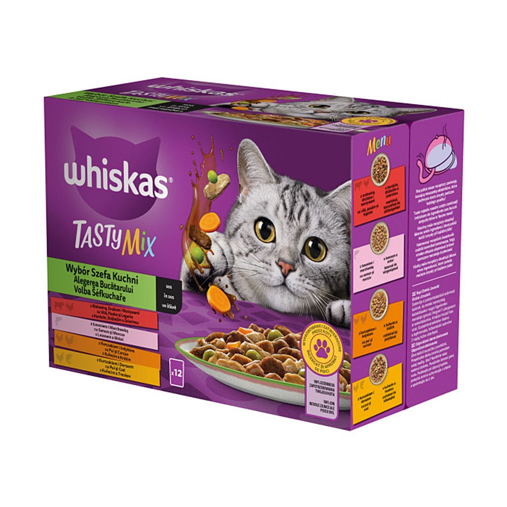 WHISKAS kapsička TastyMix Chef's Choice - hovädzina a hydina so zeleninou / losos s mrkvou / kura a morka / kura a treska v šťave 12x85g
